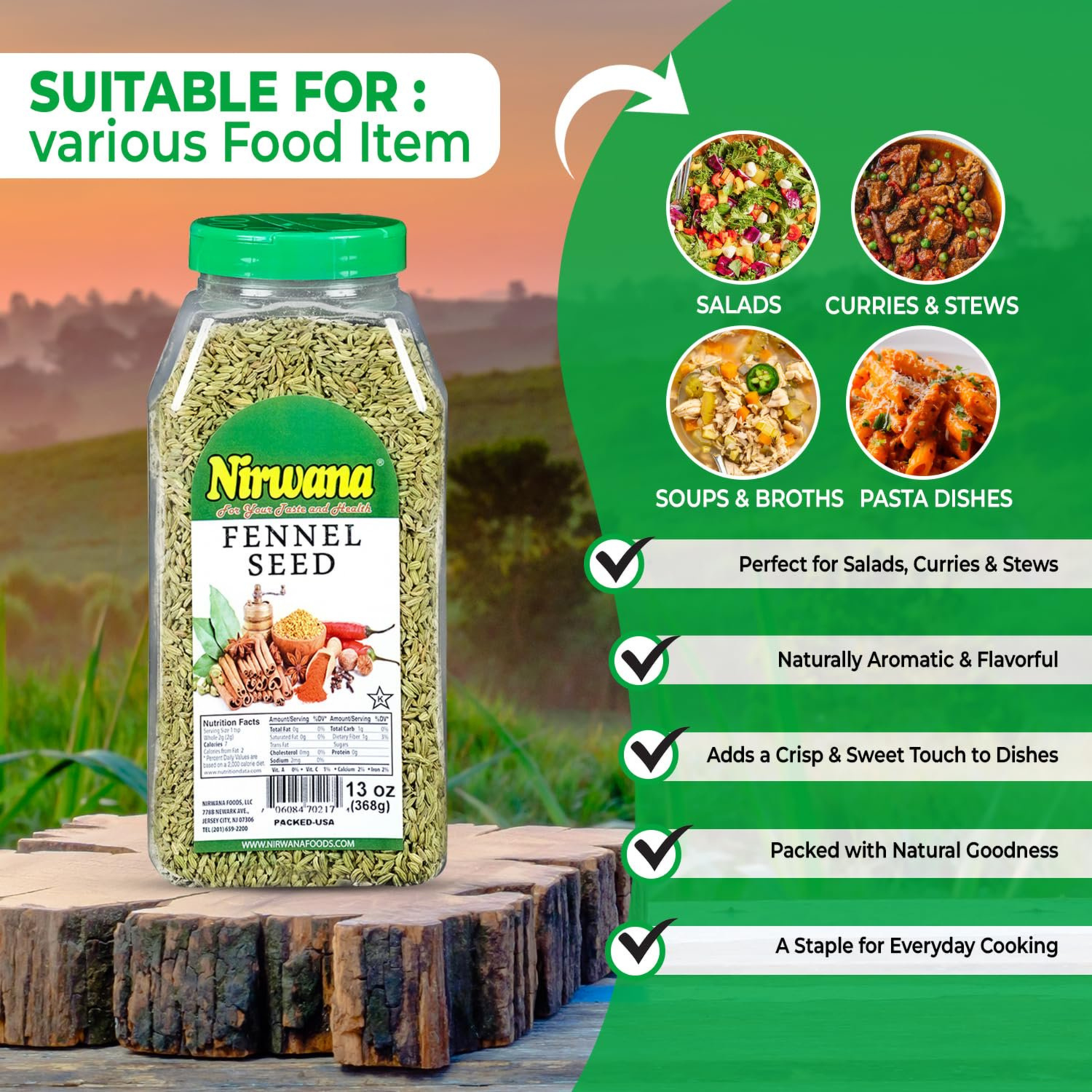 Nirwana Fennel Seeds – 13 oz Medium Jar | Premium Whole Seeds for Cooking & Spice Blends