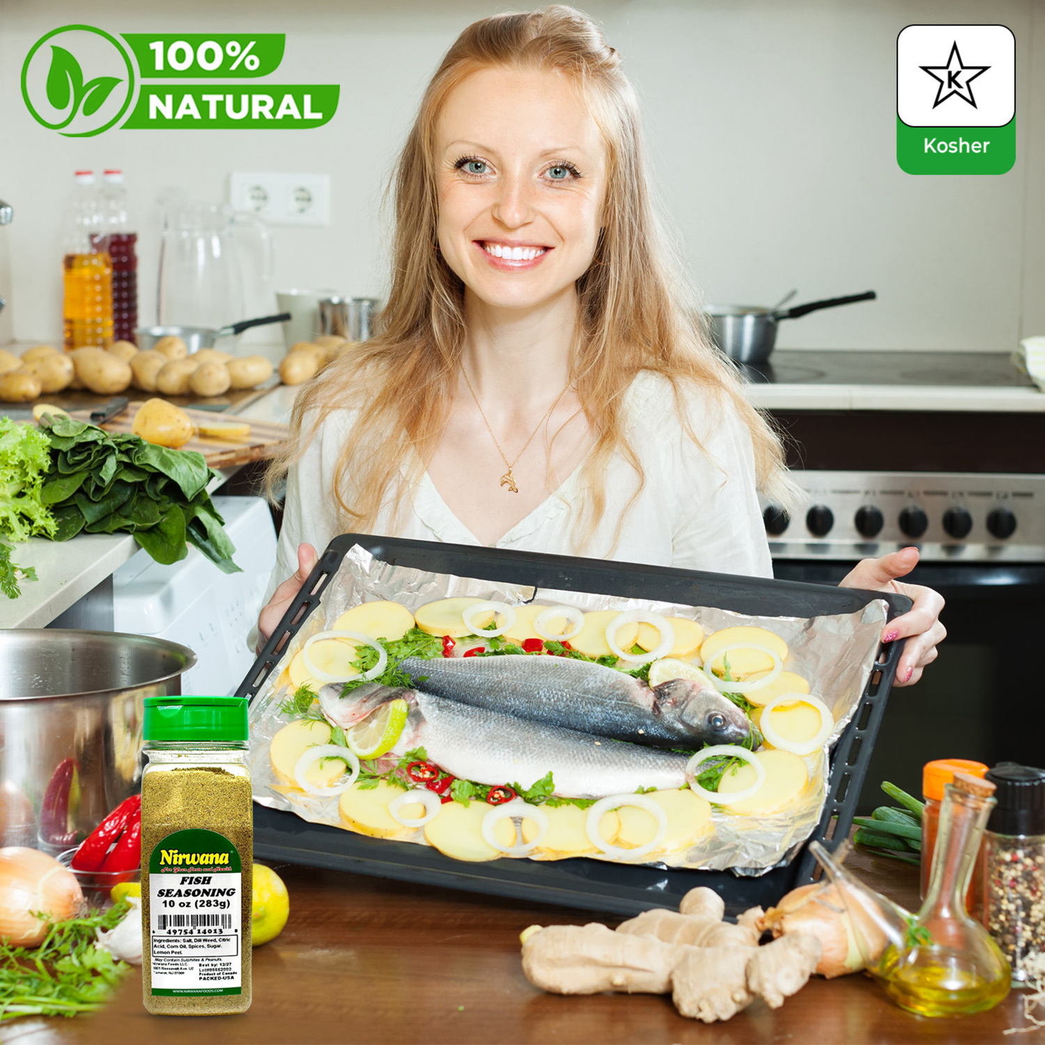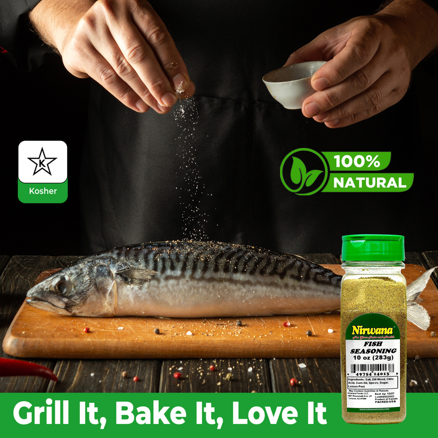 nhance your seafood dishes with Nirwana Fish Seasoning – 10oz Jar, a perfectly balanced blend of herbs and spices. Ideal for fish, shrimp, seafood, vegetables, and marinades, this seasoning delivers bold, savory flavor every time.