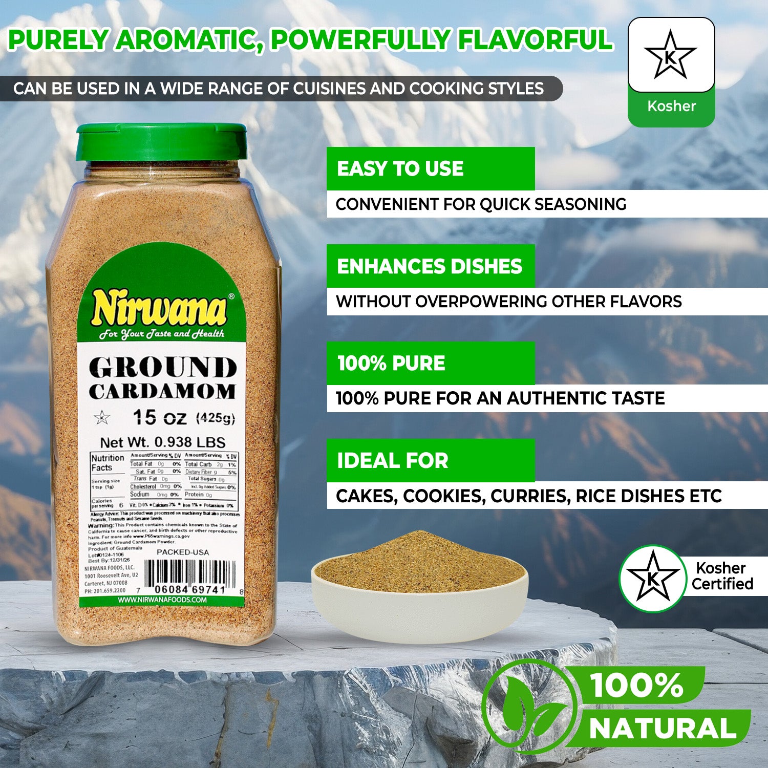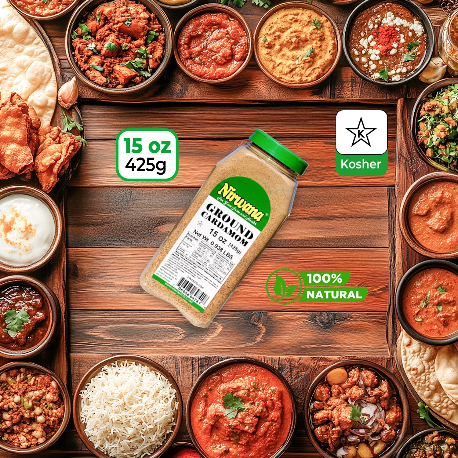 Aromatic, flavorful, and versatile, Nirwana Ground Green Cardamom – 15 oz Medium Jar is perfect for enhancing curries, desserts, beverages, and spice blends. This premium cardamom is finely ground to release its full fragrance and flavor, making it ideal for everyday cooking, baking, and professional kitchens.