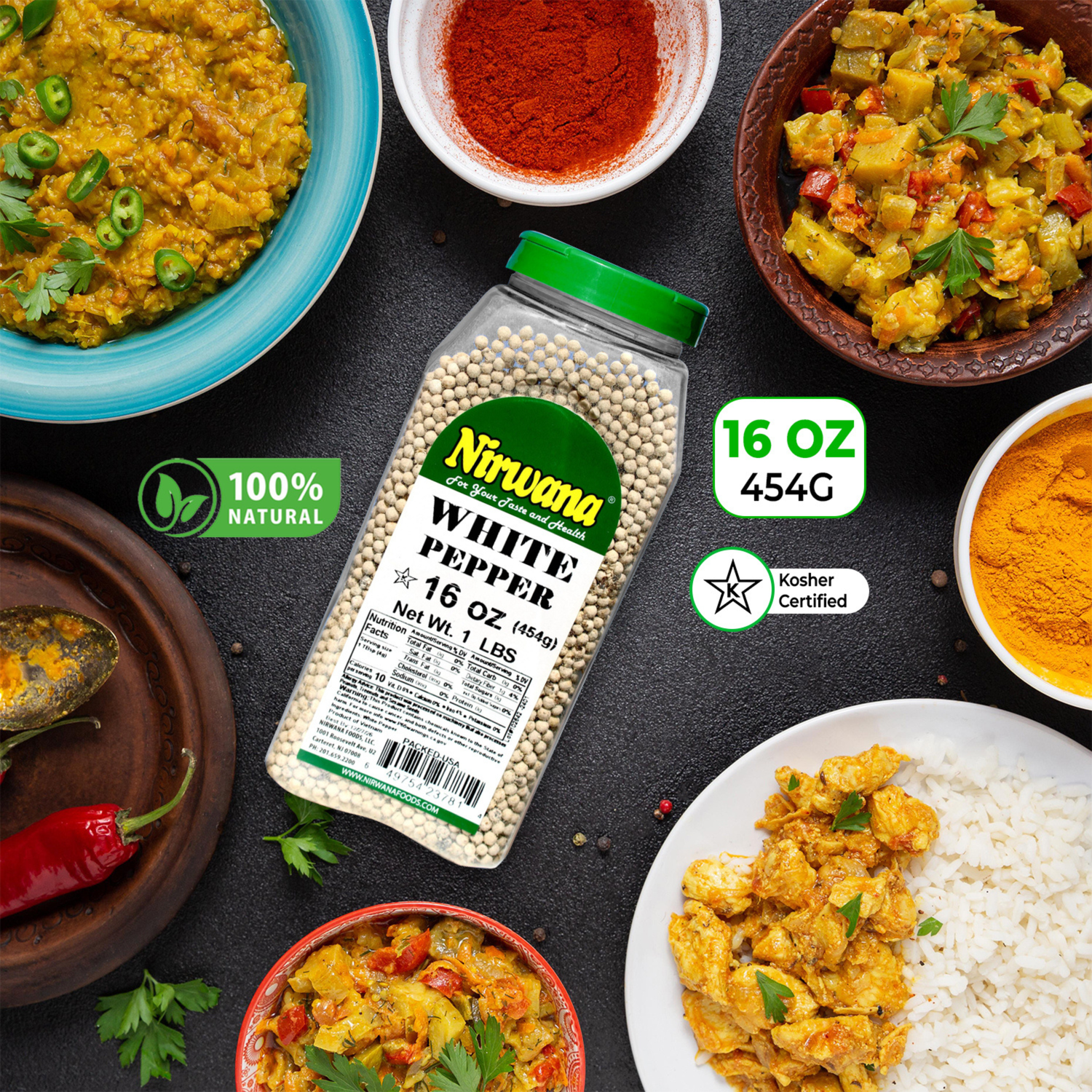 Nirwana White Pepper Whole – 16oz Medium Jar | Premium Whole White Pepper for Cooking & Spice Blends